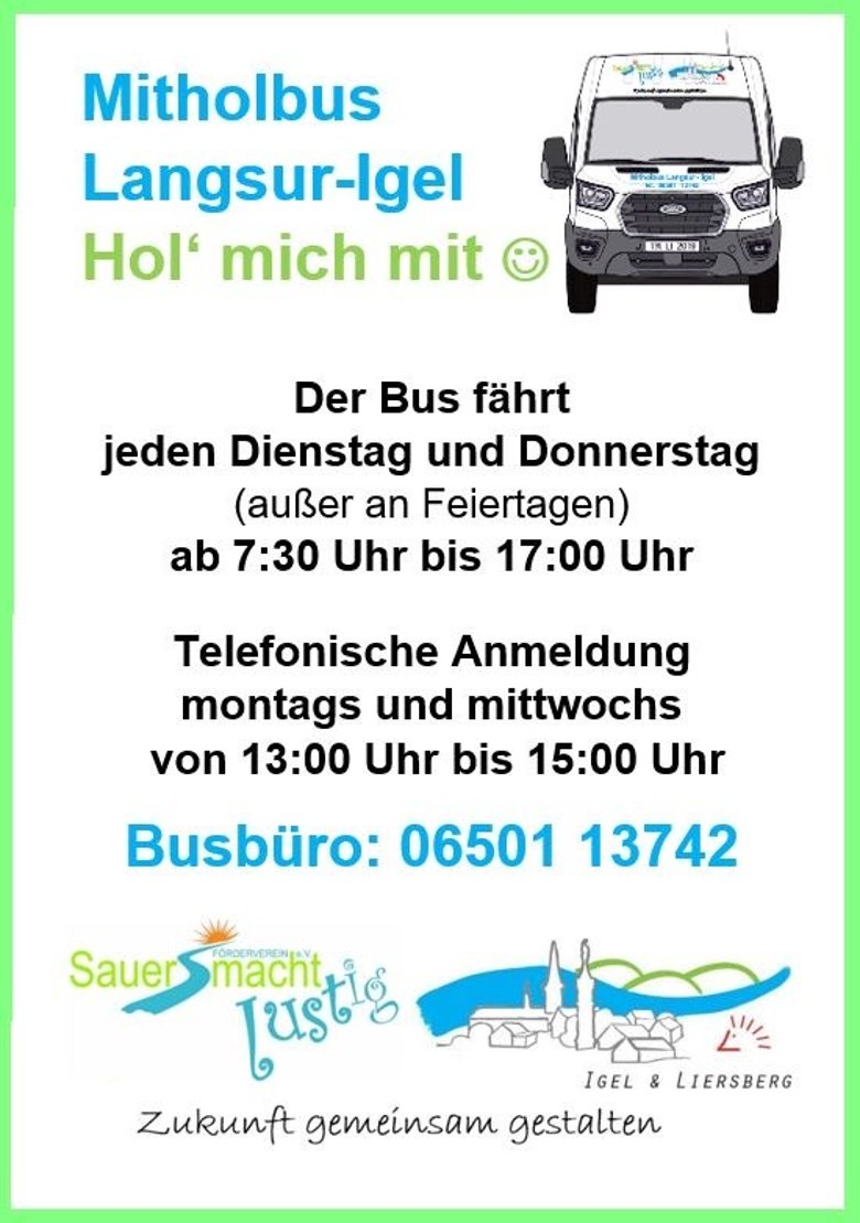 MitbürgerInnen aus den Gemeinden Langsur und Igel, die zu Hause abgeholt und irgendwohin gebracht werden möchten, rufen vorher im Busbüro an und besprechen Ziele und Zeiten.