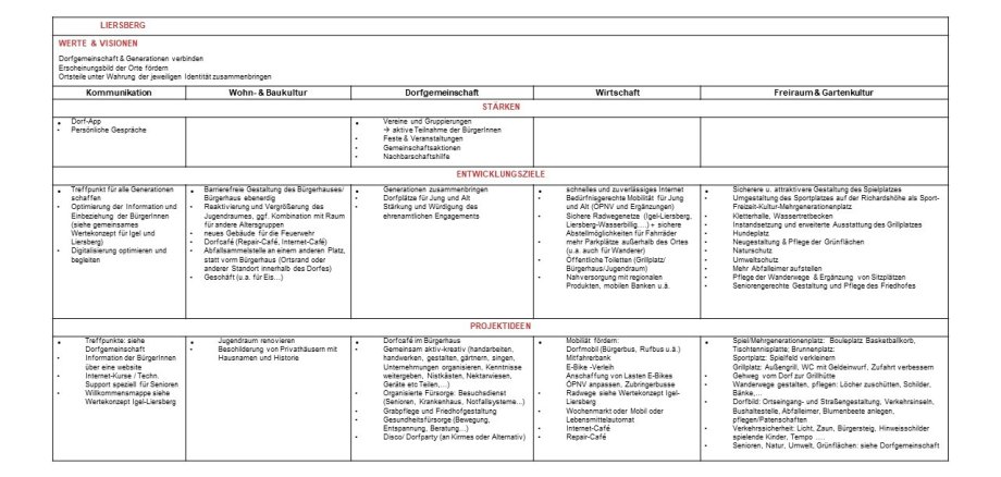 In der Bürger- und Jugendwerkstatt in Igel (November 2021), der Kinderbefragung (November 2021) und in dem ersten Dorfgespräch in Liersberg (März 2022) wurden Stärken der Gemeinde benannt sowie Entwicklungsziele und Projektideen zu fünf Handlungsfeldern für die Zukunft gesammelt. Die Ergebnisse werden in einer Tabelle als Wertekonzept festgehalten und weiterverfolgt.